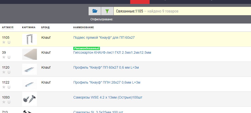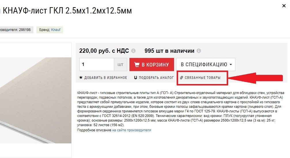 При нажатии на соответствующую кнопку в карточке товара, перед вами появится каталог с отфильтрованным списком материалов.