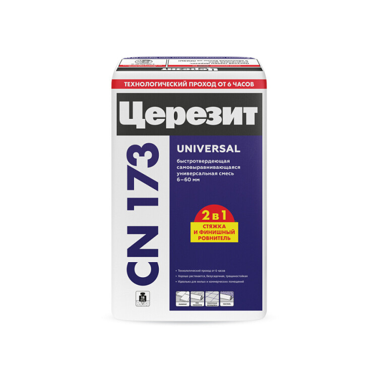 Самовыравнивающаяся смесь CN 173 предназначена для выравнивания бетонных, цементно-песчаных, ангидритных и гипсовых оснований пола под укладку керамических плиток, линолеума, ковролина, ламината и т.п. напольных покрытий, а также для изготовления и ремонта стяжек, связанных с основанием, в сухих помещениях с низкими механическими нагрузками (жилых, бытовых, административных и т.п.).