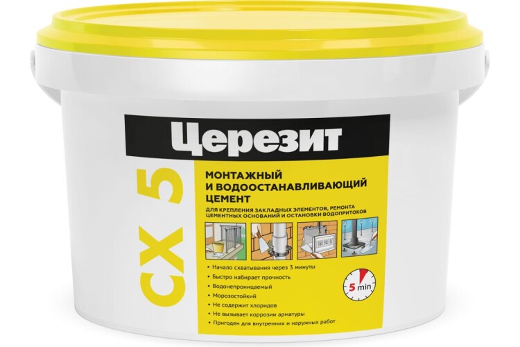 Цемент монтажный водоостанавливающий CX 5 быстросхватывающийся цемент для анкеровки стальных и полимерных закладных элементов в цементно-песчаных растворах, бетоне, кирпичных кладках, ремонта оснований, заполнения выбоин и трещин при срочном выполнении работ, а также для остановки водопритоков в бетонных и цементных ограждающих конструкциях.