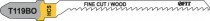 T119BO. (Lобщ./раб.=82/56 мм). Зубья: профрезированные, «волна». Пропил: криволинейный, тонкий. Для резки мягкой древесины, столярных плит,ДВП, ДСП, фанеры. Толщина реза 2-15 мм. Материал: высокоуглеродистая сталь. Упаковка: картонный конверт.