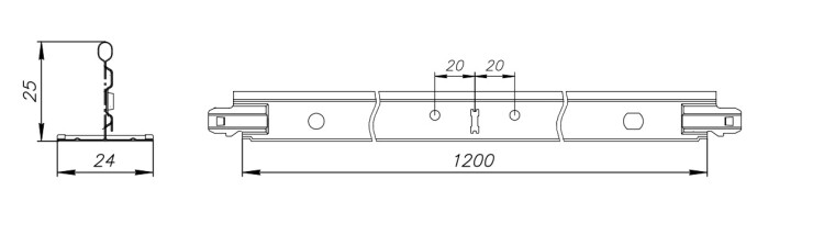 Поперечная рейка "NORMA" Т-24. Длина - 1200 мм. Профиль лицевой поверхности - 24 мм. Высота - 25 мм. Материал - Сталь. Вместимость коробки / вес - 60 шт / 11 кг. Несущая способность системы - 7 кг/м2.