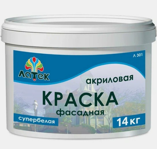 Акриловая фасадная краска Латек супербелая 14 кг Л301 LAP012 предназначена для защитно-декоративного окрашивания различных поверхностей (бетон, штукатурка, пенобетон, гипс, дерево, обои).